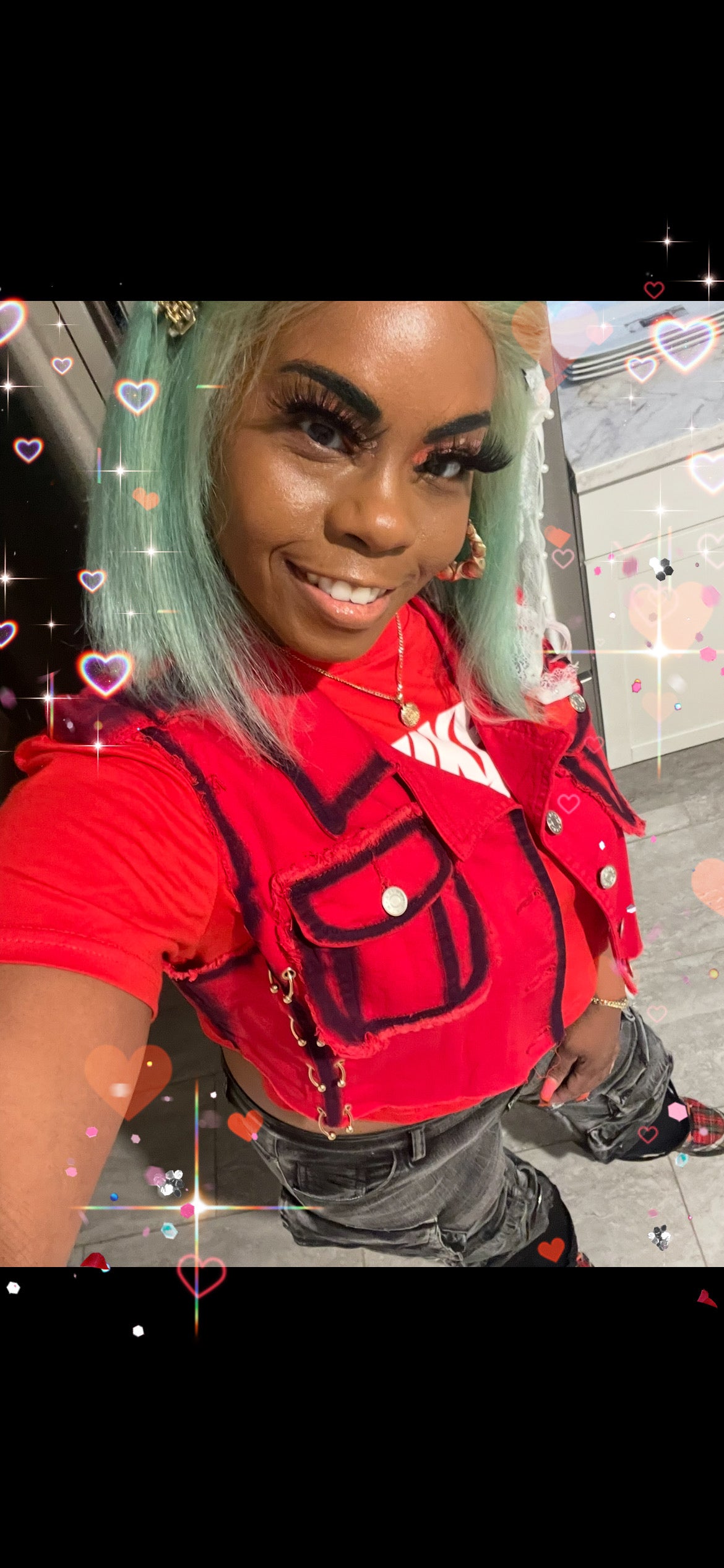 Look Paired with Fye Red Nike Crop Top and Regular size Let’s Chill Cargo Denim Jeans featured on the website!
